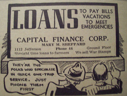 1941-1972: Capital Finance Corporation was located here. In 1956-59 the office was managed by R.P. Lux; they advertised that they made loans up to $5000. In 1941 Paul Wilson was the manager.